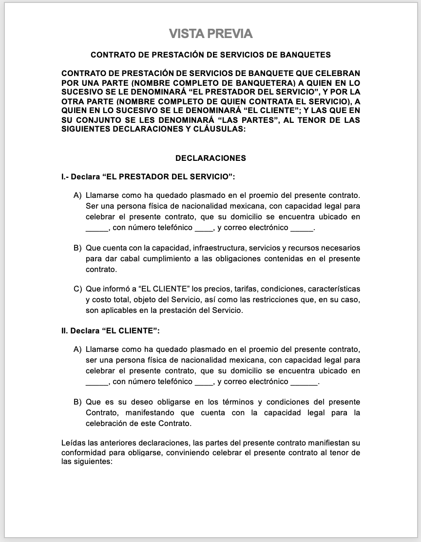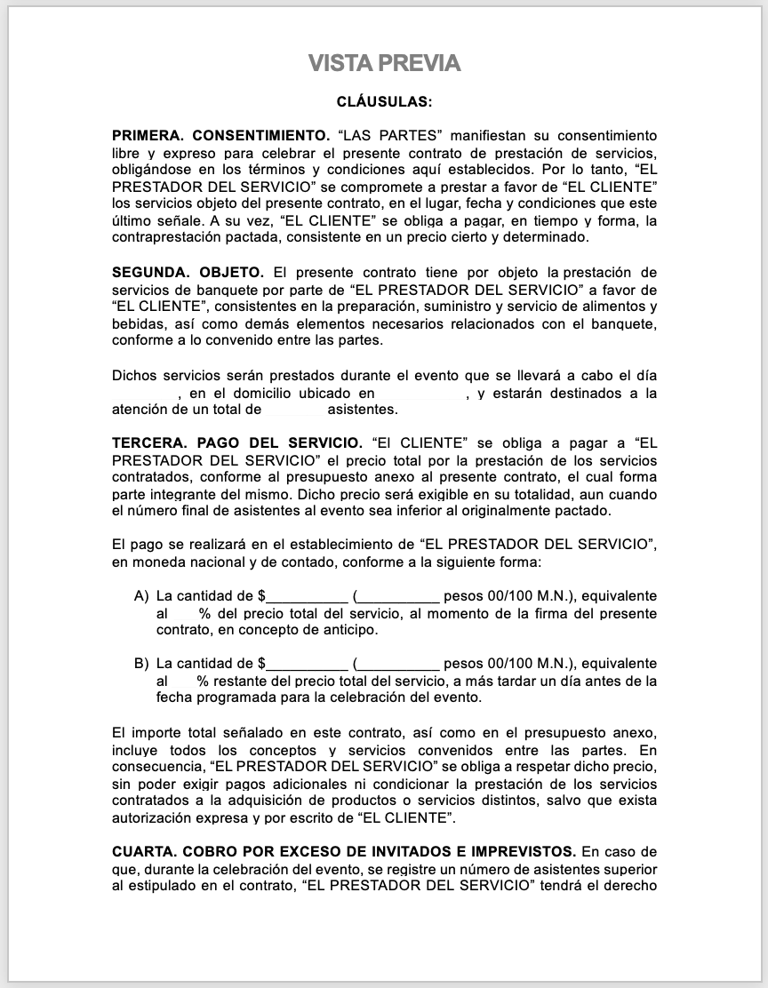 Protege tu trabajo como proveedor de banquetes con un contrato profesional y legal.